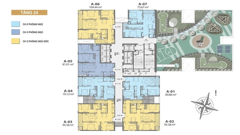 - Sân chơi trẻ em tầng 1 & sân chơi bóng rổ trên mái