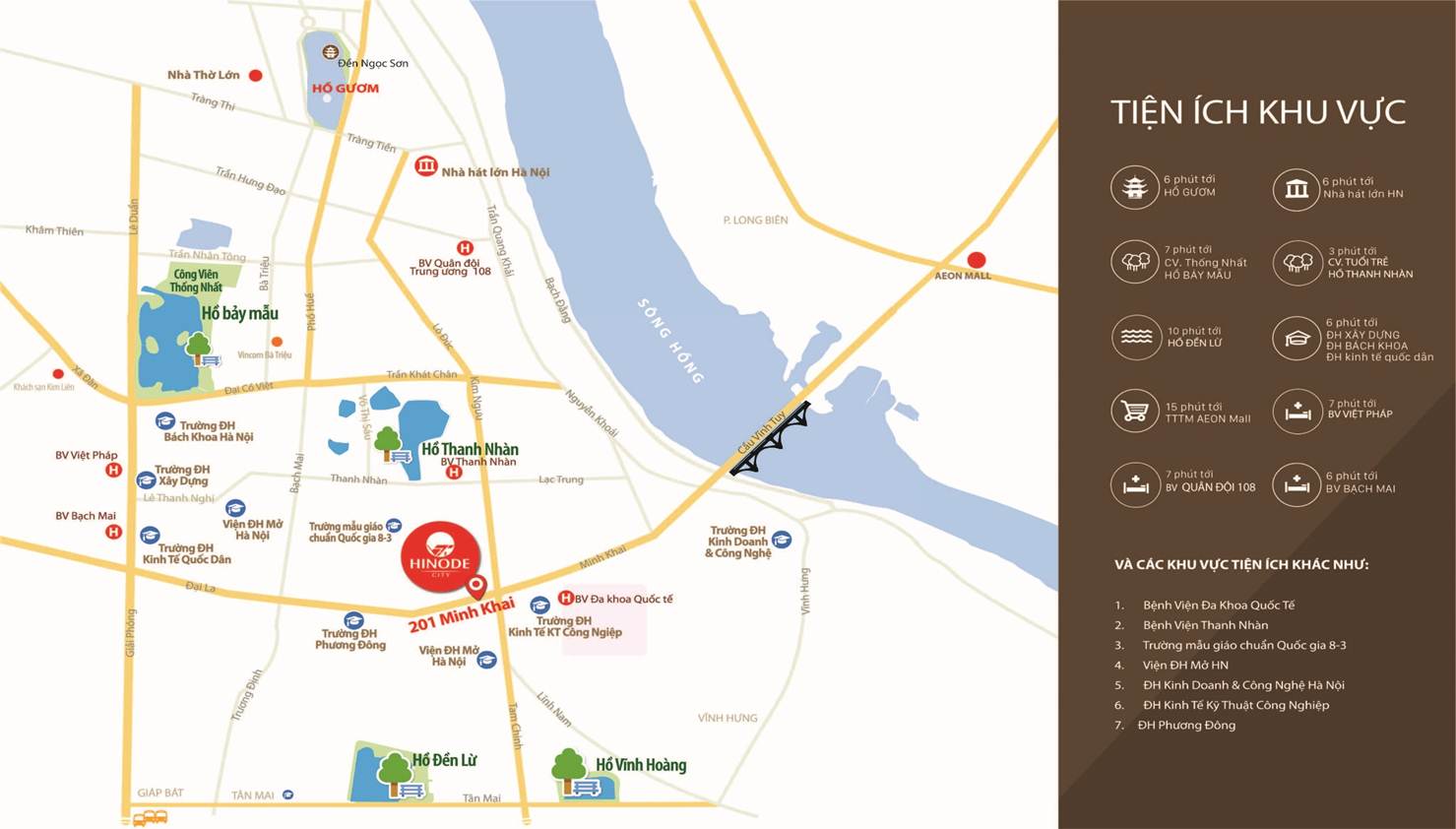 Chung cư Hinode City tọa lạc tại 201 Minh Khai, ngay ngã tư Minh Khai – Kim Ngưu có vị trí đắc địa bậc nhất quận Hai Bà Trưng là một dự án hiếm hoi sở hữu 2 mặt tiền là 2 con đường huyết mạch giao thông của phía Nam Hà Nội. Từ dự án cư dân có thể dễ dàng di chuyển đến phố cổ, các quận trọng yếu: Đống Đa, Hà Đông, Long Biên…chì vài phút nhờ hệ thống cơ sở sở hạ tầng giao thông đã được đồng bộ hoàn thiện. Đồng thời đây cũng là cửa ngõ giao thương kết nối trung tâm đến các tỉnh.